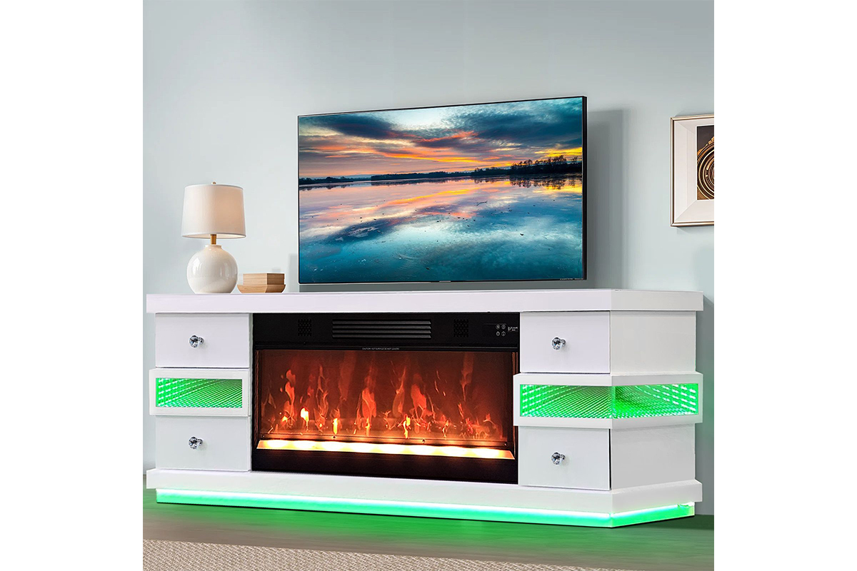 Upgrade your living space with this stylish TV unit featuring integrated LED lighting and Bluetooth connectivity for a smart experience. It also includes a built-in heating function, adding warmth and comfort to your room. Designed with 4 spacious drawers, it provides practical storage while keeping your space organized and modern.