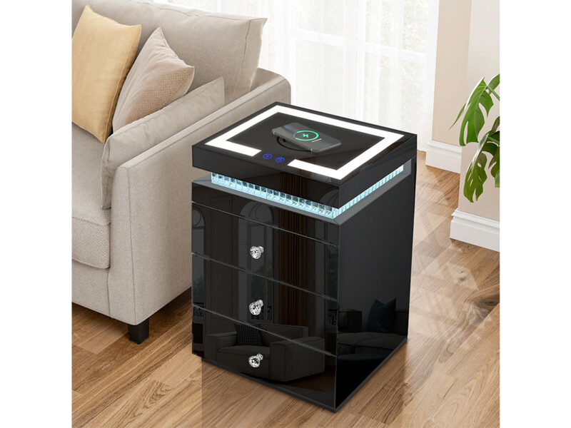 Modern nightstand with a multifunctional design, featuring a tabletop with wireless charging capability. Includes built-in LED lighting and a Bluetooth speaker for added convenience and ambiance. With intuitive touch controls and a sleek, compact style, it’s the perfect blend of technology and elegance for your bedroom.